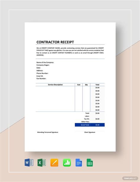Contractor Receipt Template in Microsoft Word, Excel
