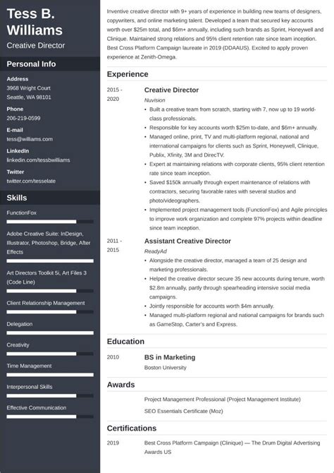Ad free resume audit tool to fix grammar & spelling mistakes. Web this free creative director resume is great for as a leader for those who work as designers, artists, copywriters, sales team, marketers, etc. Web the guide to resume tailoring. Write your contact information writing your contact information at the start of your resume makes it convenient for recruiters to see whose resume they are. Web creative director resume samples with headline, objective statement, description and skills examples. Ad find resume formats designed by hr professionals. How to be a whizz at deciding on the amount of creativity and individuality to apply in. Our examples will help you craft a standout. [first name] [last name], [degree or certification if applicable] [phone number] | [email address] | [city], [state] professional summary [two to three sentences that highlight years of experience, relevant skills, education or. Web creative director resume examples & samples. Guide the recruiter to the conclusion that you are the best candidate for the vp, creative director job. The online resume builder so easy to use, the resumes write themselves. Work with vp creative to define short and long term strategy for the creative department. Web improve your chances of getting hired in 2023 with our professional and customizable creative director resume examples. Web sections of a creative director resume. Land your dream job with free, customizable resume templates. Showcase your potential to recruiters and stand out from other candidates. Web real examples and templates of creative director resumes, updated for your 2023 job search. Web is the creative director resume sample easy for hiring managers to read and notice the creative director’s key skills? Find the right template for your resume;