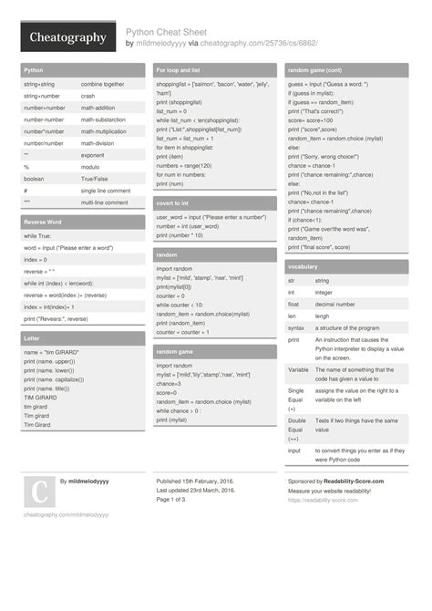 Python Cheat Sheet by mildmelodyyyy (3 pages) programming python