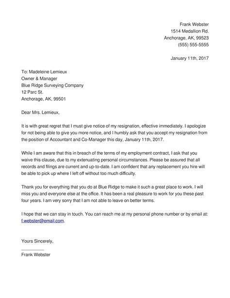 Immediate Resignation Letter Templates at