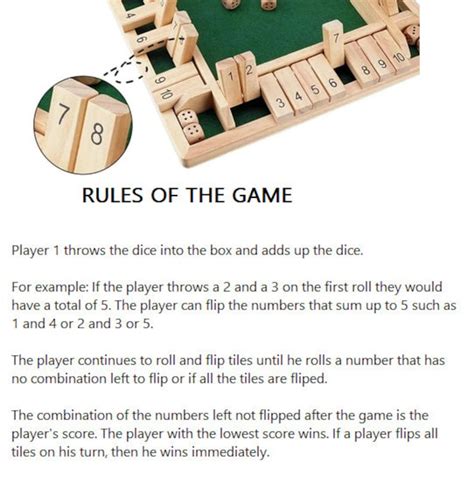 The box has a tray for rolling the. A turn consists of a player repeatedly throwing the dice until he or she cannot continue. At the start of the game all the tiles are open, showing the numbers 1 to 12. One tries to shut the box by closing the tiles. The dicing process is repeated until no more flaps.
